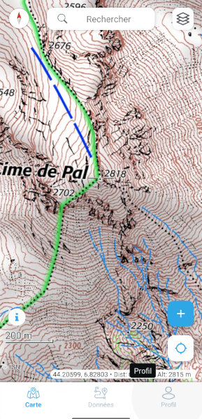 Si l’altitude n’est pas affichée: activer l’affichage de l’altitude dans les paramètres (profil > paramètres > Afficher l’altitude au centre de la carte)